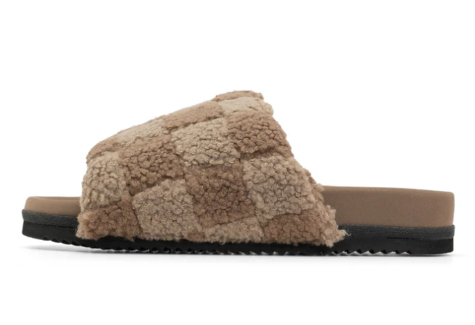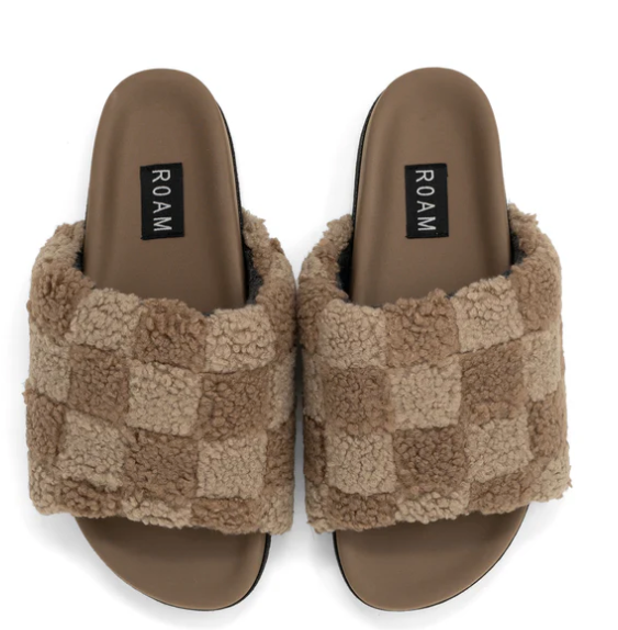 The ‘Fuzzy Checker Slider’ by ROAM is made out of luxurious faux shearling, pieced together in a playful checker pattern, and lined in breathable, cotton fleece for supreme softness. Memory foam is inserted by hand into the upper which creates extreme comfort and allows the shoe to mold to your foot for a perfectly cushioned and supportive fit.